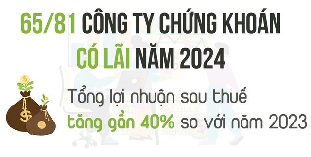 Ủy ban Chứng khoán Nhà nước cho biết, trong năm 2024, cơ quan này tiếp tục thực hiện công tác tái cấu trúc và tăng cường công tác quản lý, giám sát hoạt động của các công ty chứng khoán. Một công ty đã bị đình chỉ hoạt động từ ngày 13/9/2024 và 1 công ty nằm trong diện bị kiểm soát. Hiện tại, toàn thị trường có 81 công ty chứng khoán đang hoạt động. Năm 2024, ước tính 65/81 công ty chứng khoán có lãi, với tổng lợi nhuận sau thuế tăng gần 40% so với năm 2023.