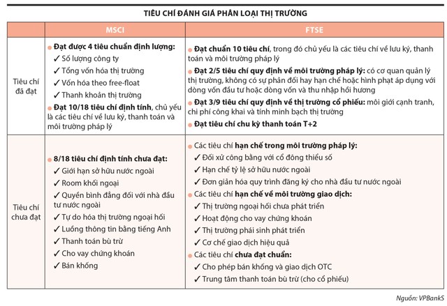 Kỳ vọng, thị trường Việt Nam có thể được thông báo nâng hạng vào tháng 9/2025 theo các tiêu chí của FTSE và chính thức nâng hạng vào tháng 9/2026. Đối với các tiêu chí của MSCI, Việt Nam có thể được đưa vào danh sách theo dõi nâng hạng trong kỳ đánh giá thường niên vào tháng 6/2026 và chính thức nâng hạng vào kỳ đánh giá tháng 6/2027.