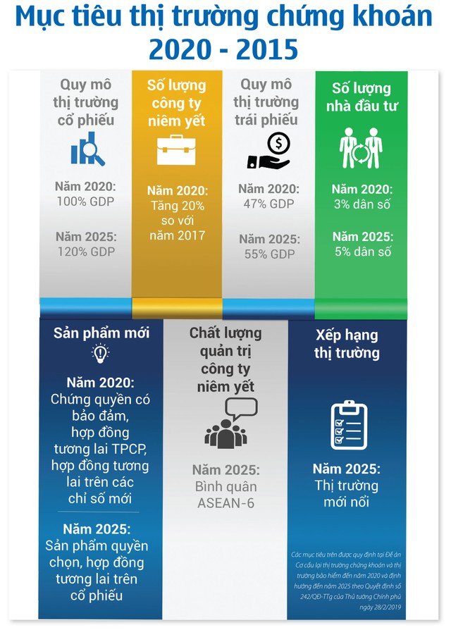 Bên cạnh các chỉ tiêu mang tính định lượng như: Phấn đấu quy mô thị trường cổ phiếu đạt 100% GDP vào năm 2020 và 120% GDP vào năm 2025; quy mô thị trường trái phiếu đạt mức 47% GDP vào năm 2020 và 55% GDP vào năm 2025; số lượng công ty niêm yết đến năm 2020 tăng 20% so với năm 2017..., điểm đáng chú ý tại Đề án này là Chính phủ đưa ra hệ thống giải pháp nhằm khắc phục một trong những “điểm nghẽn” khiến TTCK khó lớn đó là thiếu sự phối hợp vào cuộc đồng bộ của các bộ, ngành liên quan.