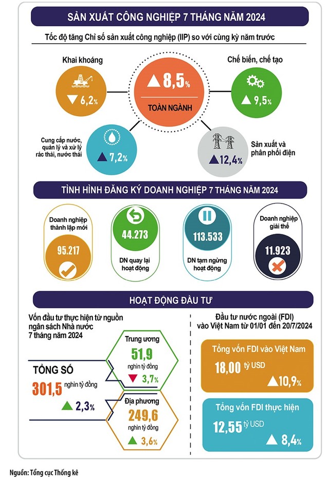 Tương tự, nhiều chỉ số kinh tế vĩ mô tích cực khác có thể viện dẫn. Chẳng hạn, thu ngân sách nhà nước 7 tháng ước tăng 14,6% so với cùng kỳ năm trước; tổng mức bán lẻ hàng hóa và doanh thu dịch vụ tiêu dùng tháng 7/2024 tăng 1,4% so với tháng trước và tăng 9,4% so với cùng kỳ năm trước, tính chung 7 tháng tăng 8,7%...