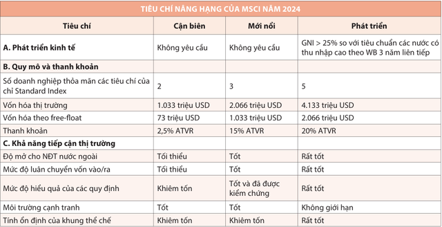 Ngày 20/6/2024, MSCI sẽ công bố chính thức kết quả phân loại quốc gia, tuy nhiên với tiêu chí về công bố thông tin và nhiều tiêu chí khác chưa được cải thiện, có lẽ khả năng cao thị trường chứng khoán Việt Nam lại tiếp tục lỡ hẹn với kế hoạch nâng hạng.