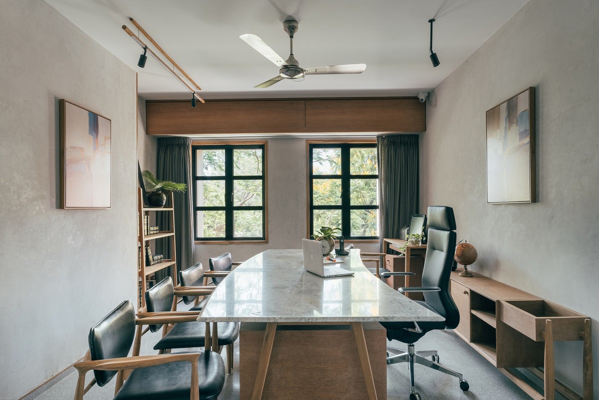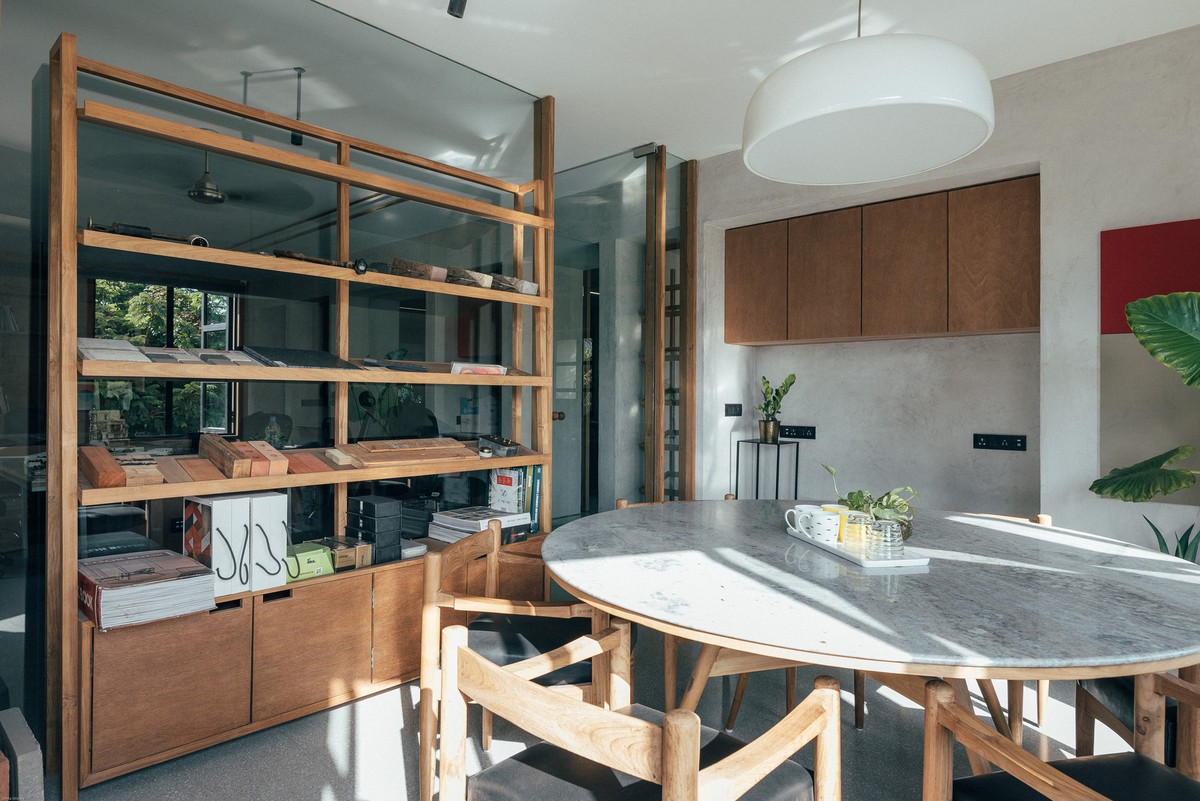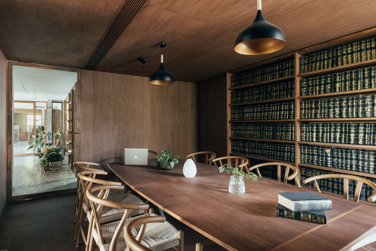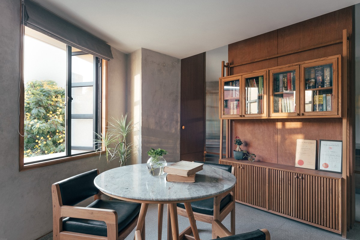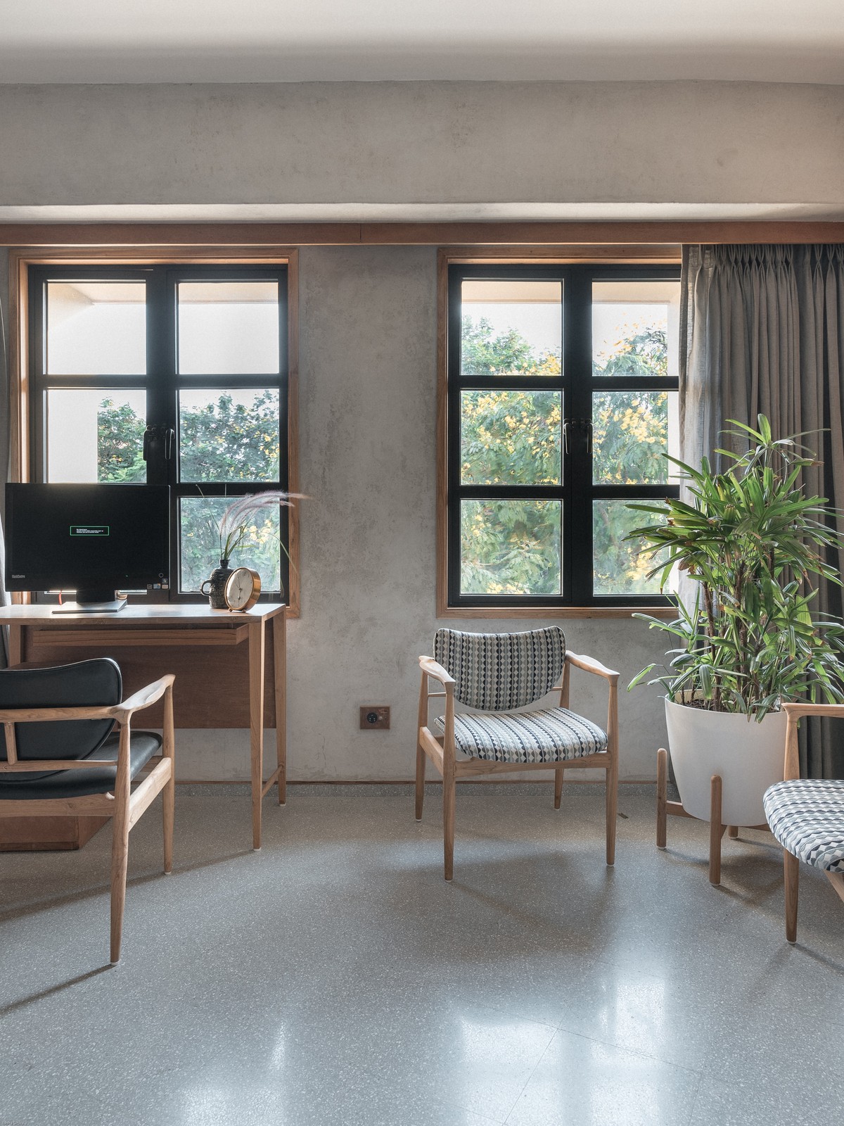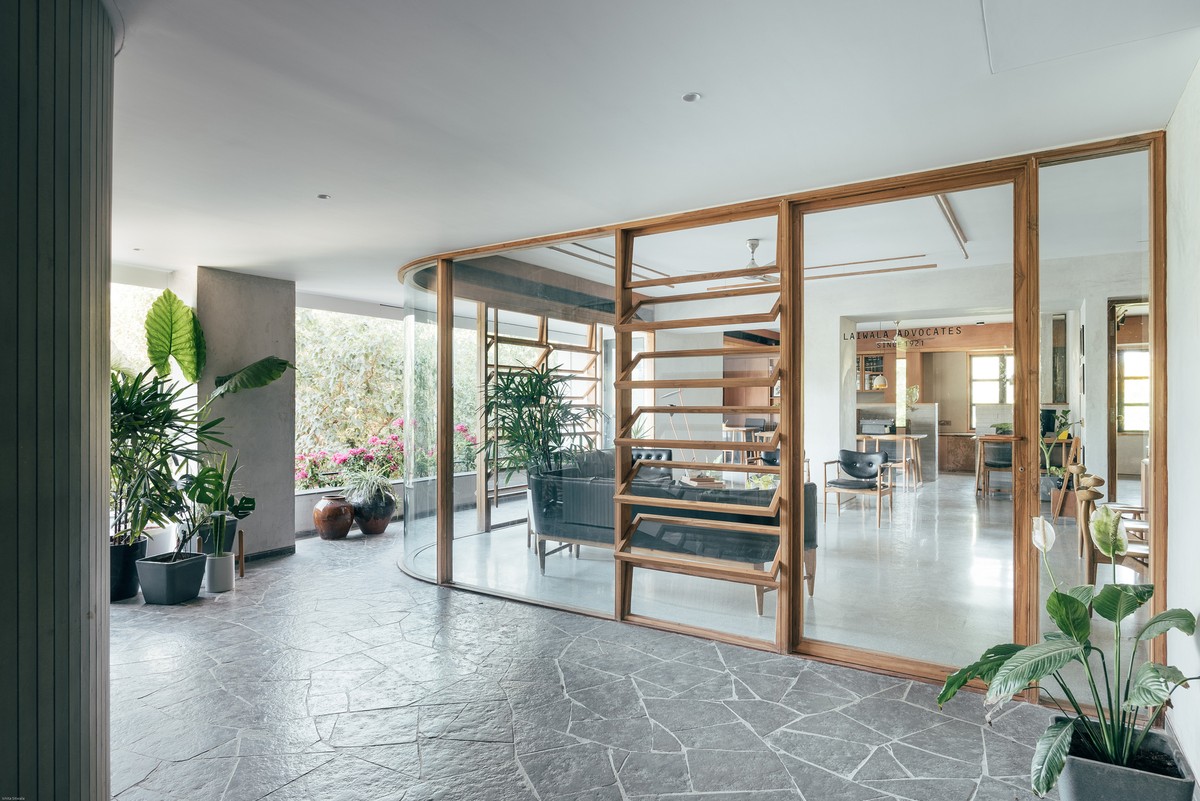 Các tấm cửa kính kết hợp gỗ làm nổi bật lên các khung cửa, vùng sáng và vùng tối, ghi dấu ấn về một môi trường làm việc chuyên nghiệp nhưng không hề xa cách.
