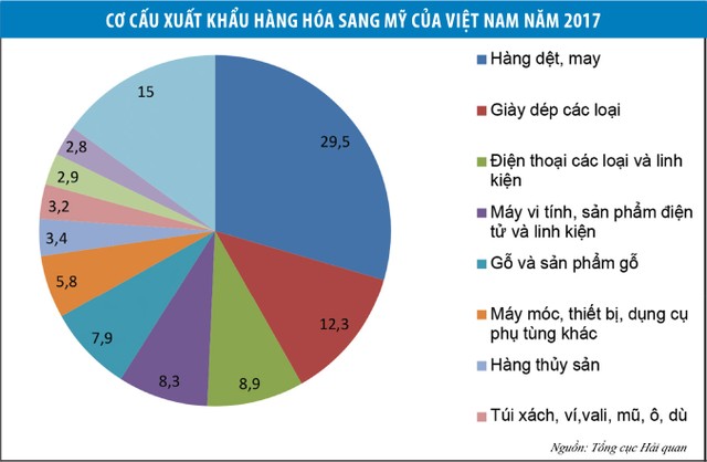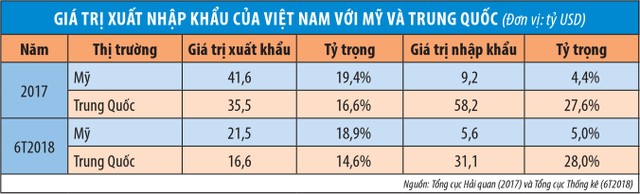 Trong khi Trung Quốc là thị trường nhập khẩu lớn nhất của Việt Nam, thì Mỹ là thị trường xuất khẩu lớn nhất của Việt Nam. Năm 2017, Việt Nam xuất siêu 32,4 tỷ USD sang Mỹ, con số này trong 6 tháng đầu năm 2018 là 15,9 tỷ USD.