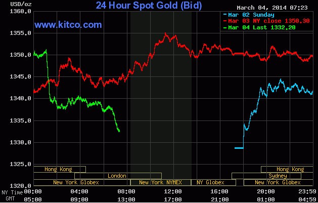 Đến 10h sáng trên sàn London, giá vàng giao ngay gaimr 0,8% so với phiên trước xuống còn 1.339,25 USD/ounce. Giá vàng giao tháng 4 cũng giảm 0,8% còn 1.339,2 USD/ounce trên sàn Comex.