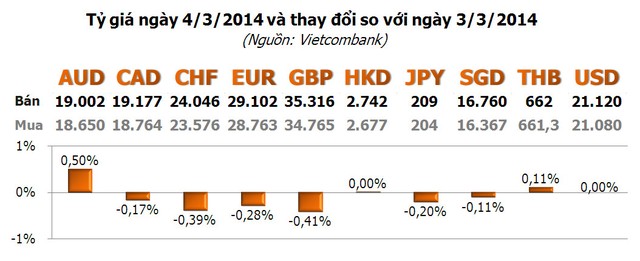 Trong khi đó, giá USD do Vietcombank niêm yết tiếp tục duy trì mức 21.080 - 21.120 đồng/USD ngày thứ 6 liên tiếp.