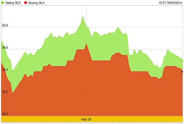 Tại thị trường trong nước, giá vàng SJC đầu giờ sáng nay tăng lên mức cao 36m45 - 36,60 triệu đồng/lượng trước khi giảm, còn 36,40 - 36,50 lúc 4h30 chiều, giảm 50.000 đồng/lượng so với chiều qua.