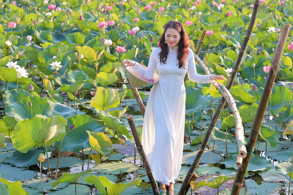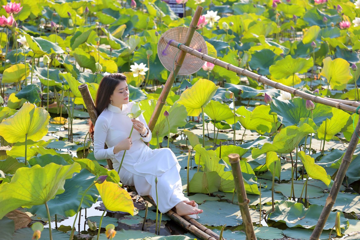 Bạn Thanh Nguyễn du khách Sài Gòn diện tà áo dài trắng tinh khôi chụp hình cùng vườn sen.
