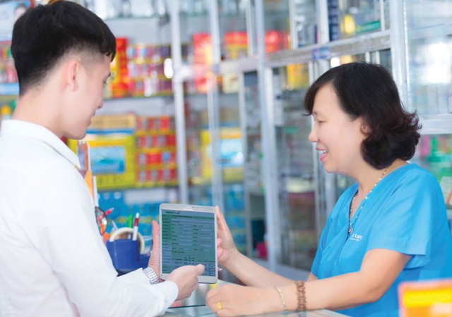 Trình dược viên Traphaco bán hàng tại nhà thuốc.