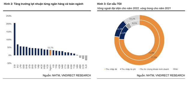 Theo VNDirect, ngành ngân hàng ghi nhận tăng trưởng lợi nhuận mạnh mẽ trong 2022 (+33,7% so với cùng kỳ) – tốt hơn nhiều so với kỳ vọng của thị trường (+20% so với cùng kỳ) và so với kết quả năm 2021 (+30% so với cùng kỳ) – dựa trên tổng thu nhập hoạt động (TOI) tăng 20,1% so với cùng kỳ nhờ tăng trưởng tín dụng tốt (+14,2% so với cùng kỳ), NIM mở rộng (+20 điểm cơ bản và đạt 3,8%), thu nhập từ phí tăng 14,6% so với cùng kỳ...