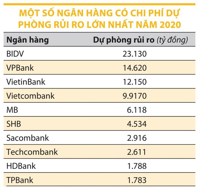 Theo thống kê từ báo cáo tài chính hợp nhất quý IV/2020 của 27 ngân hàng trong nước, tổng chi phí dự phòng của 10 ngân hàng có chi phí dự phòng rủi ro lớn nhất năm 2020 là 79.561 tỷ đồng (xem bảng).
