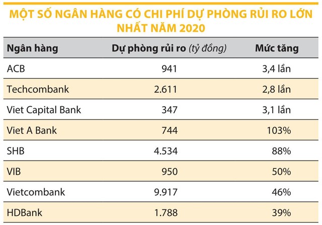 Cũng trong năm 2020, có 19/27 ngân hàng được thống kê tăng chi phí dự phòng rủi ro so với năm 2019 (xem bảng).