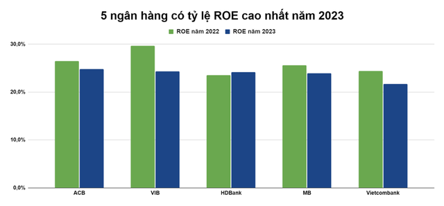 Hiện có 5 ngân hàng duy trì tỷ lệ ROE trên 20% bao gồm: ACB (24,8%), VIB (24,3%), HDBank (24,2%), MBBank (23,9%), Vietcombank (21,7%). Tuy nhiên, trong số 5 ngân hàng đứng đầu này, ngân hàng duy nhất ghi nhận ROE tăng trưởng là HDBank.