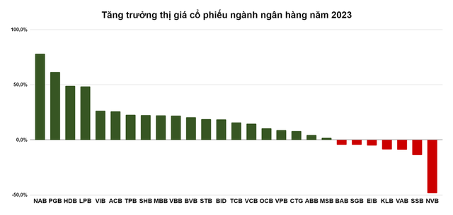 Duy trì tỷ lệ ROE cao, ACB cũng là một trong số những cổ phiếu ngân hàng khiến cổ đông “hái ra tiền” khi tăng khoảng 26% trong năm 2023. VIB cũng tạo niềm vui cho cổ đông khi cổ phiếu tăng xấp xỉ 26,4% trong năm vừa qua.