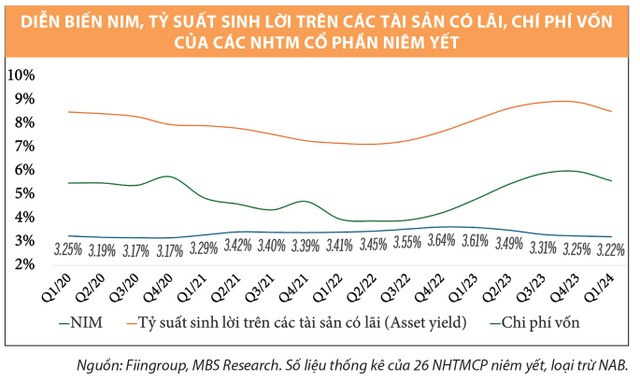Theo số liệu thống kê của 26 NHTM cổ phần niêm yết (ngoại trừ NAB), NIM trung bình vẫn tiếp tục đà giảm nhẹ, chỉ đạt khoảng 3,22% trong quý I/2024, giảm 3 điểm cơ bản so với cuối năm 2023 và giảm 42 điểm cơ bản so với đỉnh trong quý IV//2022. Điều này xuất phát từ các nguyên nhân: