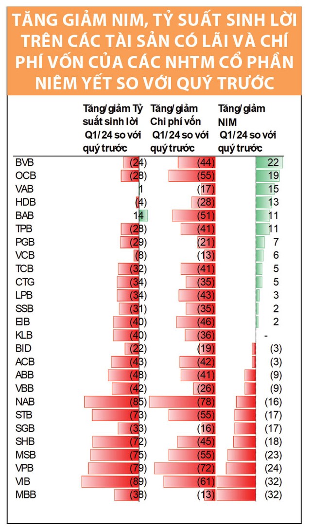 Nếu như nhìn vào dữ liệu của từng NHTM niêm yết thì việc giảm NIM có sự phân hóa thậm chí một vài NHTM quy mô nhỏ còn ghi nhận mức tăng NIM khá tốt. Theo thống kê của chúng tôi, có khoảng 13/26 ngân hàng niêm yết ghi nhận NIM quý I/2024 tăng so với quý trước đó, đa phần là các NHTM có quy mô nhỏ và có biên lãi ròng thấp trước đó, một số ít là ngân hàng lớn có ưu thế về chi phí vốn. Bên cạnh đó, có thể nói, hầu như không có ngân hàng có khả năng nâng tỷ suất sinh lời trên tài sản sinh lãi trong quý I/2024, mà việc cải thiện NIM chủ yếu đến từ ưu thế chí phí vốn giảm.