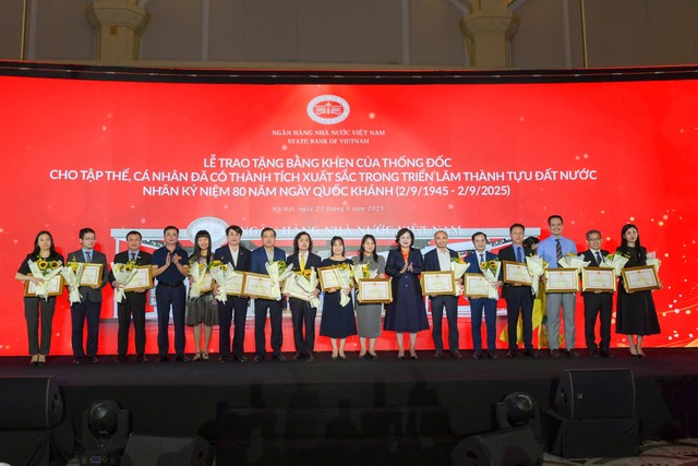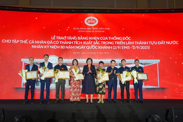 Nhân dịp này, Thống đốc NHNN đã trao tặng Bằng khen cho 22 tập thể và 10 cá nhân thuộc ngành Ngân hàng đã có thành tích xuất sắc trong tổ chức và tham gia Triển lãm thành tựu Đất nước chào mừng 80 năm ngày Quốc khánh nước Cộng hòa xã hội chủ nghĩa Việt Nam (02/9/1945 - 02/9/2025).