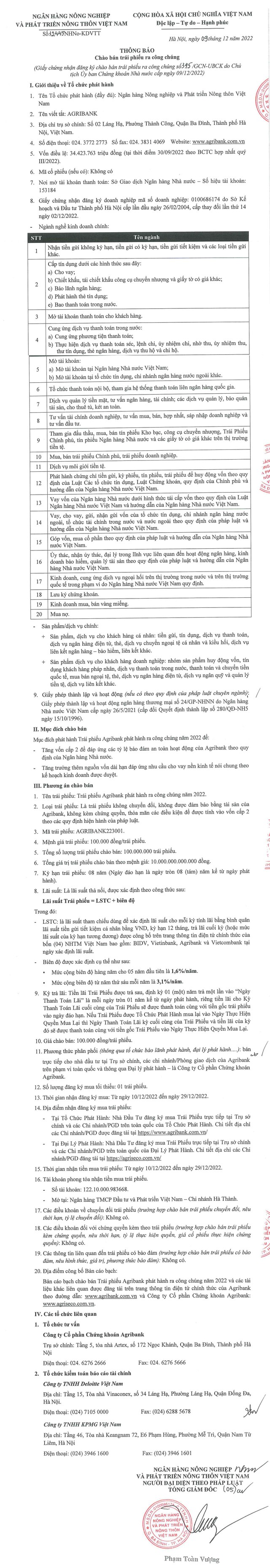 Ngân hàng Nông nghiệp và Phát triển Nông thôn Việt Nam (Agribank) trân trọng thông báo về việc phát hành trái phiếu ra công chúng năm 2022.