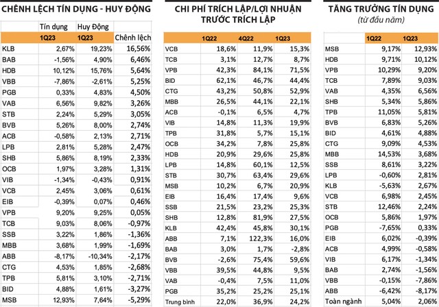Cùng với tăng trưởng tín dụng toàn ngành thấp, báo cáo tài chính quý I/2023 của các ngân hàng cho thấy, một số ngân hàng ghi nhận tăng trưởng âm trong quý đầu năm nay như ACB, VIB, ABB (toàn ngành tăng 2,06%). Bên cạnh đó, xuất hiện chênh lệch giữa tăng trưởng huy động và tín dụng khá lớn tại KLB (huy động tăng 19,23%, tín dụng tăng 2,67%), HDB (huy động tăng 15,76%, tín dụng tăng 10,12%)…