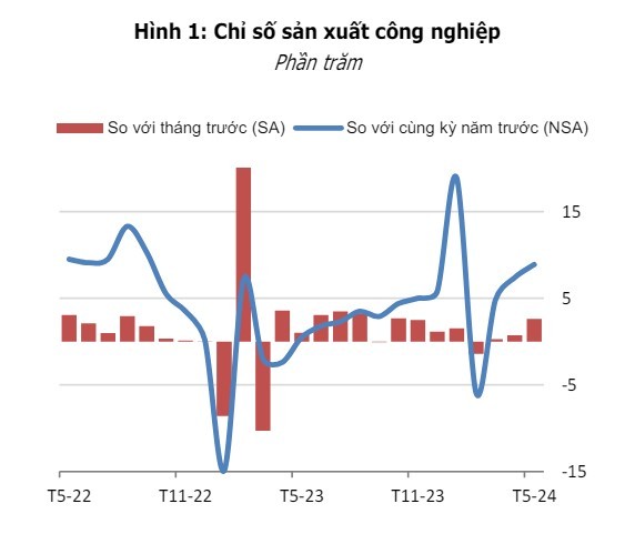 Đáng chú ý, xuất khẩu và nhập khẩu đều tăng mạnh trong tháng 5. Xuất khẩu hàng hóa tăng 6,5% so với tháng trước nhờ các sản phẩm công nghệ cao, trong khi tháng 4 ghi nhận mức giảm so với tháng 3. Đồng thời, nhập khẩu trong tháng 5 tăng 9,5% so với tháng trước, so với mức giảm 0,6% trong tháng 4. So với cùng kỳ năm 2023, cả xuất khẩu và nhập khẩu đều đạt tốc độ tăng trưởng khá lớn, lần lượt là 15,8% và 29,9% trong tháng 5/2024, một phần do hiệu ứng nền so sánh thấp so với năm 2023. Tăng trưởng nhập khẩu cao hơn so với tăng trưởng xuất khẩu dẫn đến thặng dư thương mại giảm trong tháng 5, nhưng cũng báo hiệu nhu cầu xuất khẩu tăng.