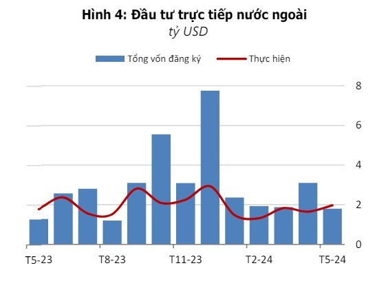 Trong khi nguồn thu tiếp tục được cải thiện thì chi tiêu công lại chậm lại. Thu ngân sách tăng lên trong tháng 5, đạt 898,4 nghìn tỷ đồng (52,8% dự toán) và lũy kế 5 tháng đầu năm 2024 tăng 14,8% so với cùng kỳ năm ngoái. Chi tiêu công chậm lại và đạt khoảng 656,7 nghìn tỷ đồng trong 5 tháng đầu năm 2024, bằng 31% dự toán, chỉ cao hơn 0,5% so với cùng kỳ năm 2023. Giải ngân đầu tư công ước đạt 148,3 nghìn tỷ đồng, bằng 22,3% dự toán được Thủ tướng Chính phủ phê duyệt và tăng 5% so với cùng kỳ năm trước.