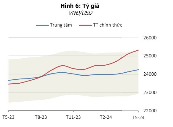 Báo cáo cũng để cập đến câu chuyện tỷ giá biến động và chịu áp lực thời gian qua. Tỷ giá thị trường VNĐ/USD tăng 8% so với cùng kỳ tính đến cuối tháng 5/2024. Lãi suất bình quân liên ngân hàng tăng nhẹ lên 4,3% trong tháng 5, so với mức 4% trong tháng 4 phản ánh chính sách thắt chặt thanh khoản của NHNN.