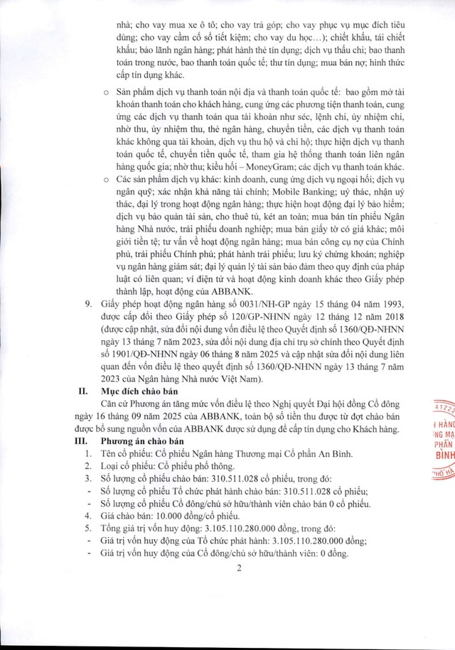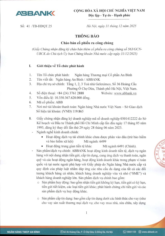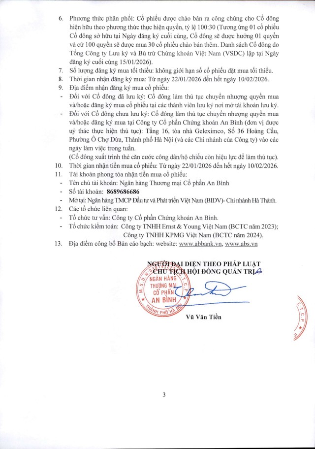 Ngân hàng TMCP An Bình (ABBank - ABB) thông báo chào bán cổ phiếu ra công chúng (Kỳ 2) 06/01/2026 08:00