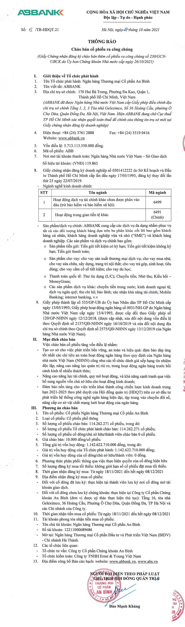 Ngân hàng TMCP An Bình (ABBank) thông báo chào bán cổ phiếu ra công chúng