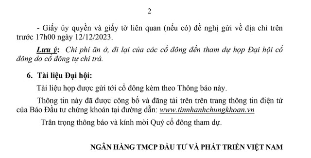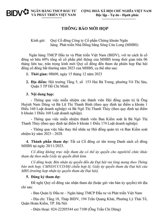 BIDV thông báo lập danh sách cổ đông có quyền tham dự ĐHĐCĐ bất thường 2023 của MHBS cổ đông lớn BIDV triệu tập