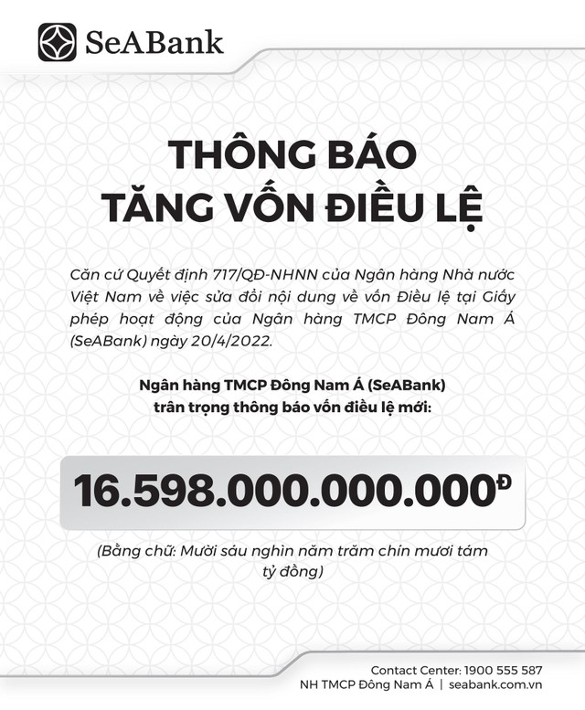 Ngân hàng TMCP Đông Nam Á (SeABank) thông báo tăng vốn điều lệ