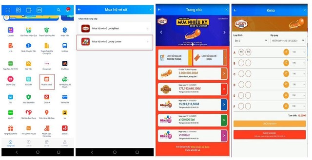 Theo ghi nhận của nhóm phóng viên, từ cuối tháng 10/2021 người dùng đã có thể đặt mua vé số qua dịch vụ Mobilott qua Ví điện tử ViettelPay hoặc VNPT Pay, dịch vụ Lucky Lotter trên ứng dụng Ví Việt hoặc Sendo, hay dịch vụ LuckyBest trên Ví Gpay. Người mua cũng có thể sử dụng ứng dụng của các ngân hàng như MBBank, Sacombank để đặt mua vé số. Tất cả các sản phẩm quen thuộc của Vietlot như Keno, Power, Mega 6/45, Max 3D, Max 3D + đều có mặt trên các ứng dụng này.