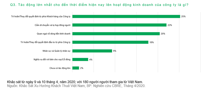 Theo đó, 79% khách thuê tham gia khảo sát lo ngại môi trường kinh doanh 6 tháng cuối năm sẽ trở nên xấu hơn; 43% khách thuê tham gia khảo sát cho rằng doanh thu sẽ giảm từ 10% đến 30% trong năm 2020; 61% khách thuê tham gia khảo sát chưa được nhận các hỗ trợ từ chủ nhà; 27% khách thuê tham gia khảo sát mong đợi các chủ nhà hỗ trợ nhiều hơn vì hoạt động kinh doanh của khách thuê đang bị ảnh hưởng nặng từ Covid-19.
