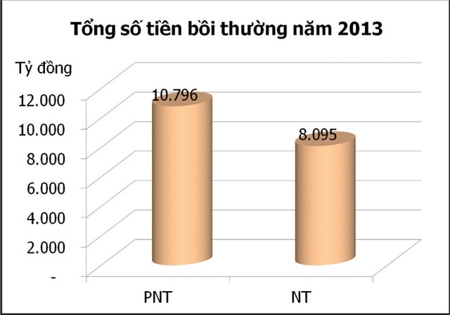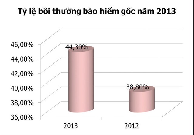 Tổng số tiền bồi thường bảo hiểm trong năm 2013 ước khoảng 18.891 tỷ đồng. Khối DN bảo hiểm nhân thọ ước bồi thường khoảng 8.095 tỷ đồng. Còn các DN bảo hiểm phi nhân thọ bồi thường khoảng 10.796 tỷ đồng, tỷ lệ bồi thường bảo hiểm gốc là 44,3%, cao hơn tỷ lệ thực bồi thường bảo hiểm gốc năm 2012 (38,8%).