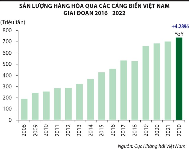 Chỉ trong 5 năm trở lại đây, sản lượng container ở Việt Nam tăng trưởng bình quân 13%/năm, nhờ tốc độ tăng trưởng xuất nhập khẩu rất cao của nền kinh tế. Năm 2021 - 2022, sản lượng container thông qua các cảng biển tại Việt Nam đạt khoảng 24 triệu TEU, cao hơn các nước như Nhật Bản, Thái Lan... Việt Nam hiện có 260 tuyến dịch vụ trên toàn quốc; phía Nam là gần 180 tuyến dịch vụ và phía Bắc trên 80 tuyến dịch vụ.