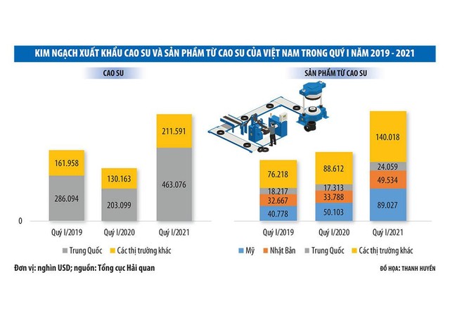 Số liệu do Tổng cục Hải quan công bố giữa tháng 4 cho thấy, giá trị xuất khẩu cao su và sản phẩm từ cao su của Việt Nam trong quý I/2021 đã vượt xa thời điểm trước khi Covid-19 xuất hiện. Gần 406.500 tấn cao su đã được xuất đi, tăng 77,4% so với với 3 tháng đầu năm 2020. Với giá bán tốt hơn, giá trị xuất khẩu cao su quý đầu năm 2021 thậm chí gấp hơn 2 lần với cùng kỳ năm 2020, đạt gần 675 triệu USD. Trong đó, riêng sản lượng cao su xuất sang Trung Quốc chiếm 71% về lượng và 68,6% về giá trị.