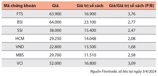 Xét về định giá theo thị giá/giá trị sổ sách (P/B), phương pháp định giá cơ bản thường được áp dụng với doanh nghiệp tài chính như ngân hàng và dịch vụ tài chính - chứng khoán, FTS và BSI là hai mã đang có định giá cao nhất, nhất là khi nhìn tương quan với các công ty chứng khoán trong Top 10 công ty có thị phần môi giới cao nhất trên sàn HOSE năm 2023.