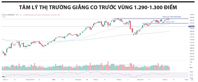 Nhìn chung, về kỹ thuật, VN-Index đã xuất hiện 4 cây nến đỏ với thân nến ngắn và đuôi dài tại hai đầu, cho thấy sự giằng co trong tâm lý khi kiểm nghiệm lại vùng đỉnh cũ tại 1.300 điểm. Bên cạnh đó, việc không thành công kiểm nghiệm mốc 1.290 – 1.300 điểm cũng có thể khiến giới đầu tư dần thận trọng, chờ đợi thêm các tín hiệu tiếp theo của dòng tiền và diễn biến thị trường. Do đó, không loại trừ khả năng chỉ số sẽ dần lùi về vùng hỗ trợ gần nhất là 1.250 - 1.260 điểm trước khi quay lại kiểm nghiệm kháng cự mạnh 1.290 - 1.300 điểm.