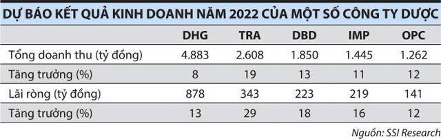 Trong quý đầu năm 2022, lợi nhuận sau thuế của Công ty cổ phần Dược Hậu Giang (DHG) tăng 25% so với cùng kỳ năm ngoái; mức tăng trưởng lợi nhuận tại Công ty cổ phần Dược phẩm Imexpharm (IMP) là gần 26%, tại Công ty cổ phần Xuất nhập khẩu Y tế Domesco là hơn 32%, tại Công ty cổ phần Traphaco (TRA) là 60,2%, tại Công ty cổ phần Dược phẩm Trung ương Vidipha là 54,4%, tại Công ty cổ phần S.P.M là gần 135%, tại Công ty cổ phần Hóa - Dược phẩm Mekophar là 150,4%.