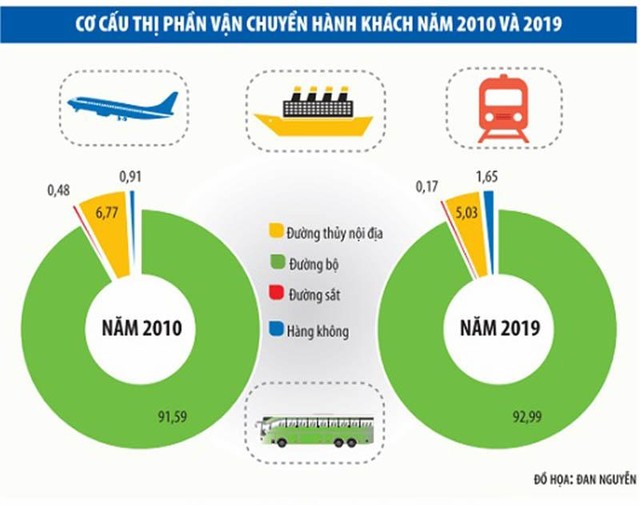 Như một “miếng da lừa”, trong giai đoạn 2010 - 2019, mỗi năm ngành đường sắt đều đặn mất 0,2 - 0,4% thị phần. Đến năm 2019, thị phần vận tải hành khách chỉ còn 0,17% và thị phần vận tải hàng hóa trong lĩnh vực đường sắt chỉ còn 0,24%.