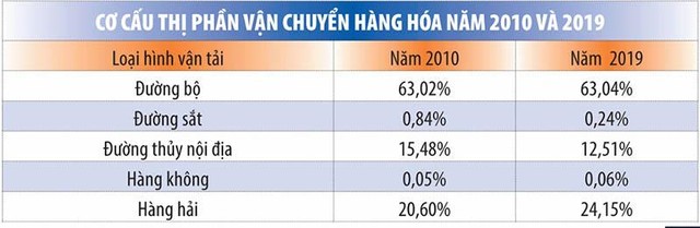 Ở mảng vận tải hàng hóa đường sắt, tình hình bi đát không kém. Năm 2019, khi vẫn chưa phải đón nhận tác động nặng nề của đại dịch Covid-19 và của 4 dự án nâng cấp tuyến đường sắt Thống Nhất theo lệnh khẩn cấp, sản lượng vận tải hàng hóa trong lĩnh vực đường sắt chỉ còn 5,1 triệu tấn so với 7,86 triệu tấn của năm 2010. Trong giai đoạn 2010 - 2019, đường sắt là phương thức vận tải hàng hóa duy nhất có tăng trưởng âm, với mức giảm bình quân khoảng 3,9%/năm.