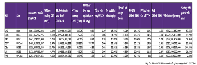 Trong 9 tháng 2024, CSV và DGC có tỷ suất lợi nhuận cao nhất lần lượt là 14% và 31%; còn PAC, DDV, CSV có mức tăng trưởng lợi nhuận ấn tượng từ mức nền thấp của năm trước, lần lượt là 53,36%, 200,89% và 51,05%. Ngoại trừ PAT, chỉ số D/E của các doanh nghiệp hóa chất khá thấp.