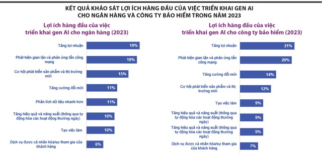 Các kết quả khảo sát trên thể hiện, ngành ngân hàng, bảo hiểm không bỏ qua làn sóng này. Gen AI được các CEO coi là khoản đầu tư quan trọng nhất cho tổ chức của họ. Những lợi ích hàng đầu của việc triển khai Gen AI cho cả hai ngành đều nổi bật với “tăng lợi nhuận” và “phát hiện gian lận và phản ứng tấn công mạng” lần lượt ở vị trí hàng đầu và thứ hai.