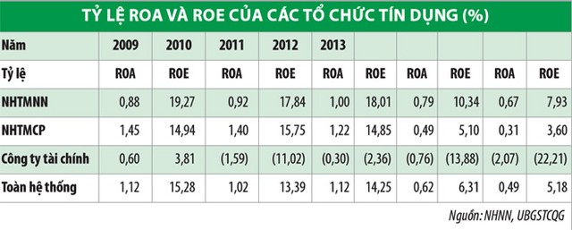 Theo Ủy ban Giám sát tài chính quốc gia và Ngân hàng Nhà nước (NHNN), trong năm 2013, tổng tài sản của toàn bộ hệ thống ngân hàng tăng 15%, huy động tăng 23%, tín dụng tăng 13,17% so với năm 2012. Tuy nhiên, lợi nhuận của các ngân hàng đã sụt giảm đáng kể. Tỷ lệ lợi nhuận trên vốn chủ sở hữu (ROE) trung bình đã giảm từ 15% năm 2009 xuống 5% vào năm 2013. Đây là kết quả tất yếu của việc tăng trưởng tín dụng thấp, ứ đọng vốn, chi phí trích lập dự phòng cao, giảm chênh lệch lãi suất cho vay và huy động. Xu hướng này được dự đoán sẽ còn tiếp diễn, ít nhất là trong năm 2014.