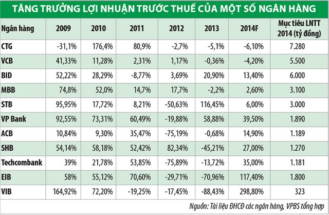Hai ngân hàng có hoạt động được đánh giá là hiệu quả nhất trong nhóm các ngân hàng TMCP là MBB và STB cũng chỉ đưa ra mục tiêu tăng trưởng lợi nhuận khiêm tốn, lần lượt là 2,6% và 6%. Eximbank và VIB đặt mục tiêu lợi nhuận trước thuế cao gấp 2 - 4 lần trong năm 2014 do lợi nhuận đã sụt giảm nghiêm trọng trong năm 2013. Tuy nhiên, dù có đạt được mục tiêu, hai ngân hàng này vẫn chưa trở lại được mức sinh lời của những năm 2012 trở về trước. Một số ngân hàng được dự đoán sẽ tăng trưởng lợi nhuận tốt trong năm tới là VPBank, Techcombank, SHB.