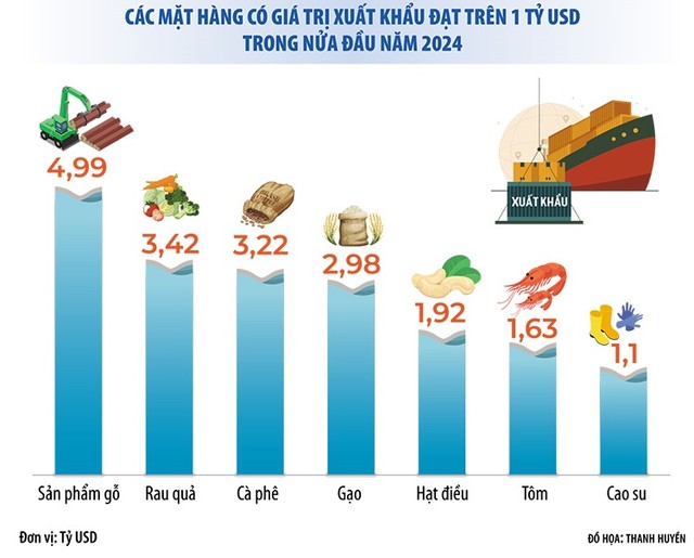 Cụ thể, tổng kim ngạch xuất khẩu nông, lâm, thủy sản 6 tháng đầu năm đạt 29,2 tỷ USD, tăng 19% so với cùng kỳ năm 2023. Trong đó, xuất khẩu nhóm nông sản chính đạt 15,76 tỷ USD, tăng 24,4%; xuất khẩu lâm sản chính đạt 7,95 tỷ USD, tăng 21,2%; xuất khẩu thủy sản 4,36 tỷ USD, tăng 4,9%; sản phẩm chăn nuôi 240 triệu USD, tăng 3,8%...