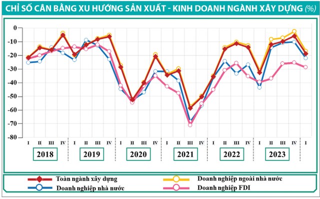 Báo cáo xu hướng sản xuất - kinh doanh ngành xây dựng với sự khảo sát 5.045 doanh nghiệp hoạt động trong ngành này do Tổng cục Thống kê thực hiện cho thấy, mặc dù có sự cải thiện trong quý I/2023, nhưng từ quý II/2023, chỉ số cân bằng xu hướng sản xuất - kinh doanh của ngành xây dựng bắt đầu xu hướng đi ngang và quý IV/2023 cho thấy sự đi xuống rõ rệt.