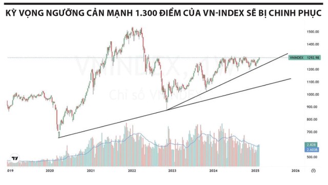 VN-Index đã dao động phổ biến trong vùng 1.180 - 1.300 điểm suốt từ đầu năm 2024 đến nay, với mốc 1.280 là điểm cản mạnh trong 3 tháng qua. Ngày 19/2/2025, chỉ số vượt qua mốc này, nhưng 1.300 điểm mới là thách thức lớn nhất.