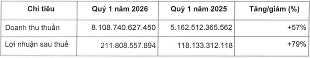 Trong đó, kết thúc quý I/2026, Công ty ghi nhận doanh thu thuần đạt gần 8.109 tỷ đồng, tăng trưởng 57%; lợi nhuận sau thuế đạt 211,8 tỷ đồng, tăng trưởng 79% so với cùng kỳ và hoàn thành 32,1% mục tiêu cả năm.