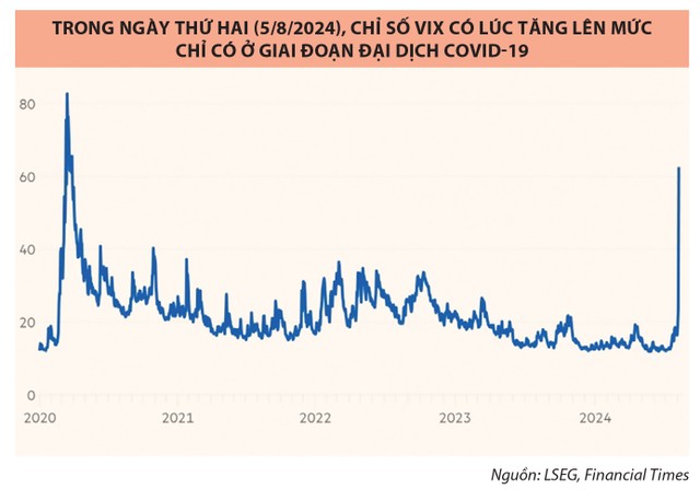 Chỉ số VIX, một thước đo độ biến động của thị trường Mỹ, thường được truyền thông đại chúng gọi là “chỉ số sợ hãi” đã đóng cửa trên mức 30 điểm ở ngày thứ Hai tuần trước và có lúc tăng lên trên 60 điểm, chỉ dưới mức của đợt biến động do Covid-19. Nó có thể phản ánh nỗi sợ dài hạn, nhưng cũng có thể chỉ là giao dịch hoảng loạn nhất thời.