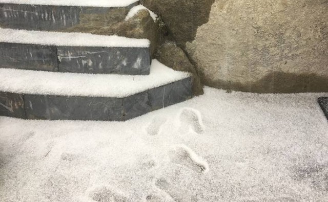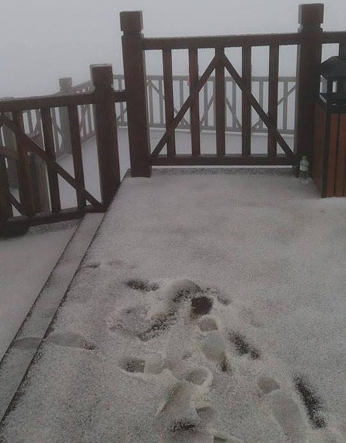 Chữ viết của du khách trên nền phủ đầy mưa đá trắng xóa.