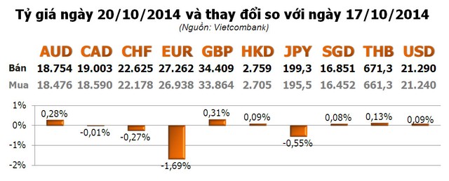 Với các ngoại tệ khác, có tăng, có giảm. Trong đó, giảm mạnh nhất là EUR với -1,69%; tiếp theo là JPY với -0,55%... Ở chiều tăng, mạnh nhất là GBP với 0,31%; tiếp đến là AUD với 0,28%...